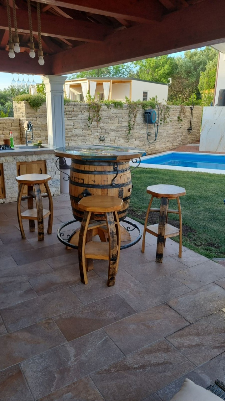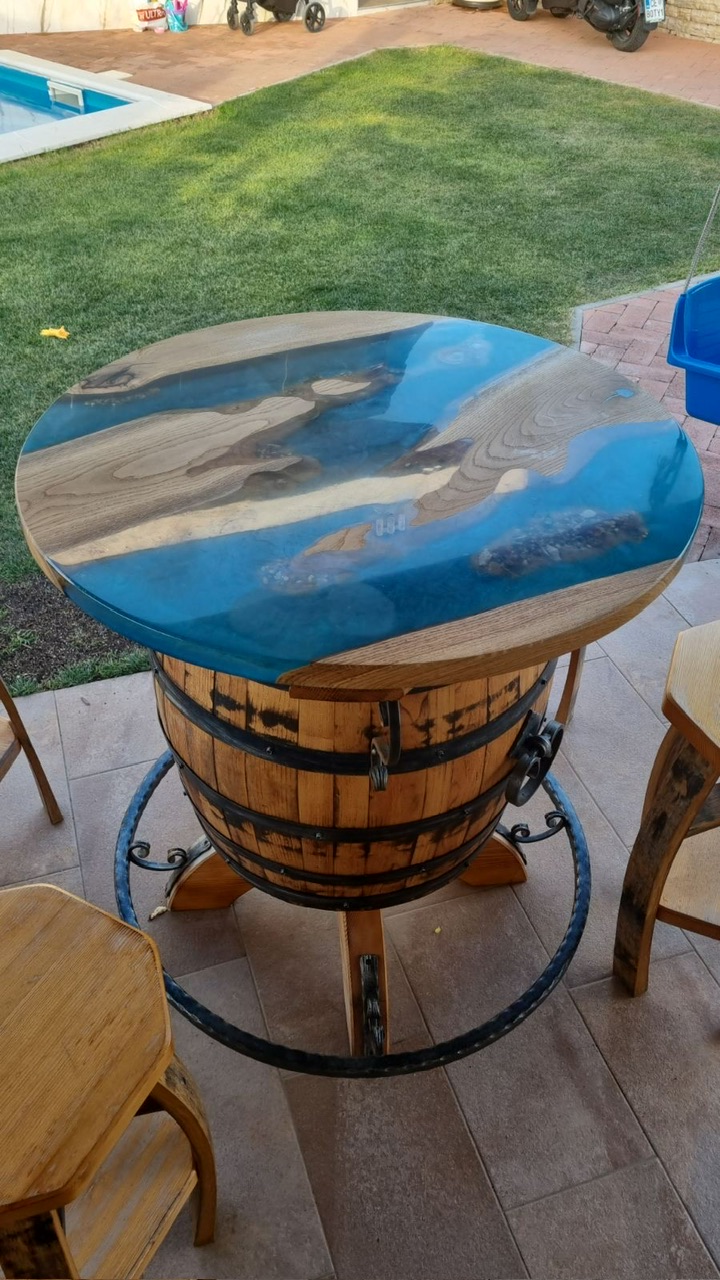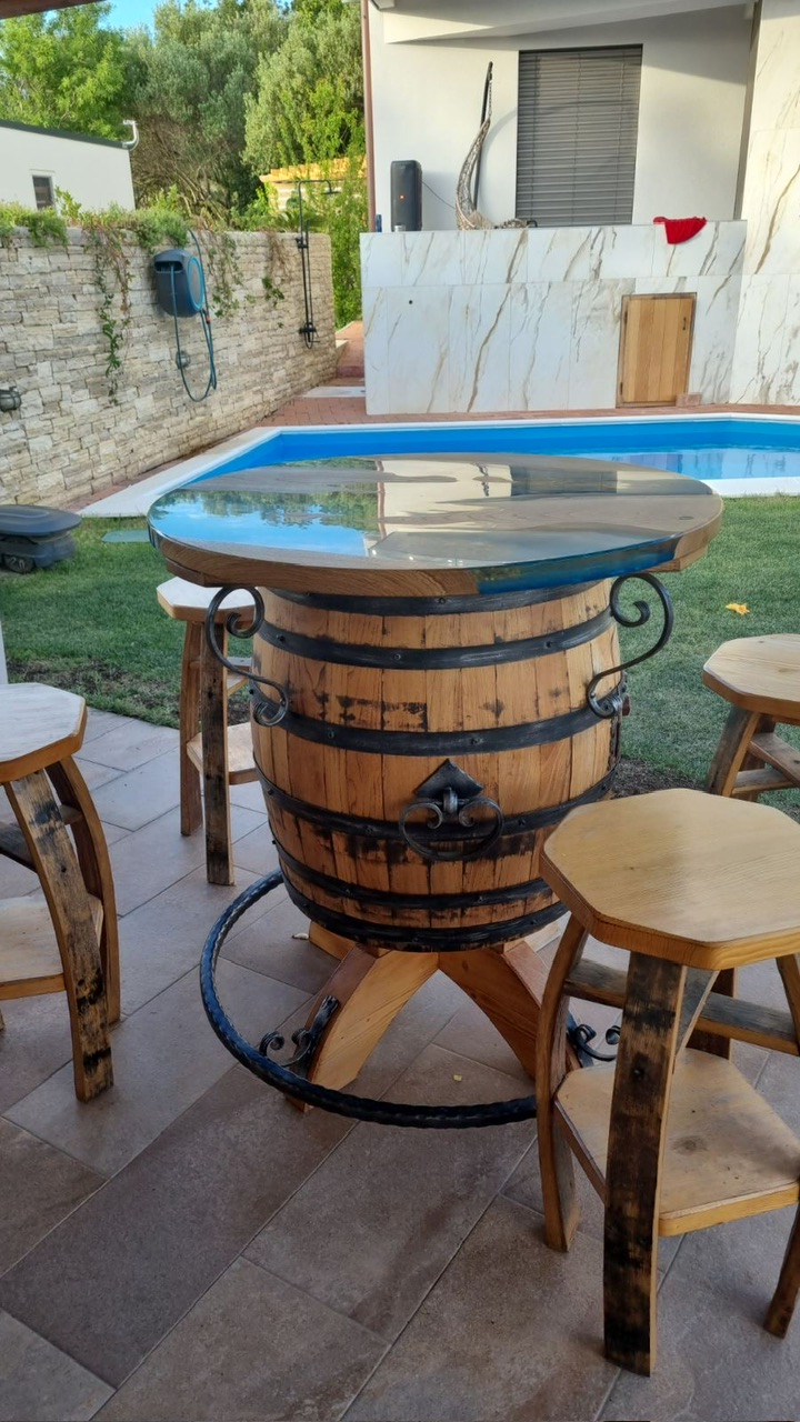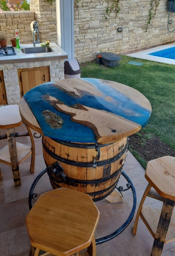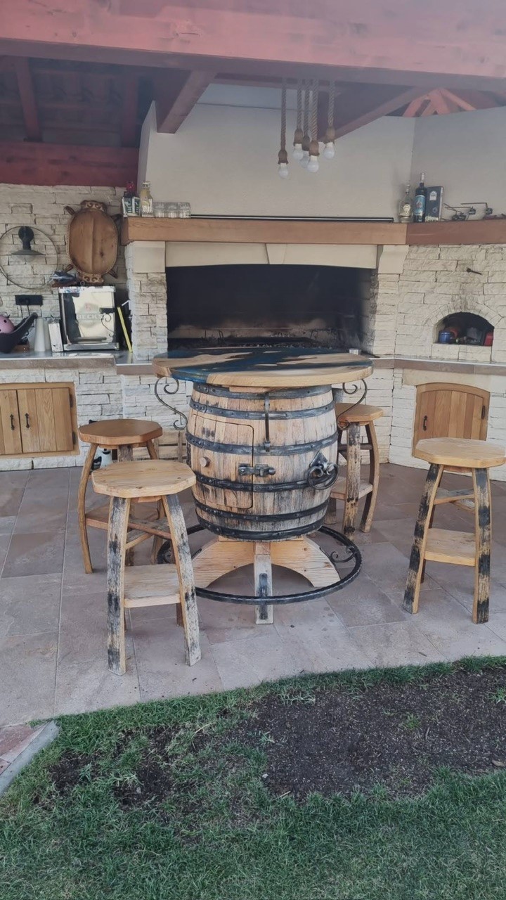 Barska miza narejena iz hrastovih sodov. Višina mize od 110-115cm, fi plošče je 100 cm oz. po naročilu.