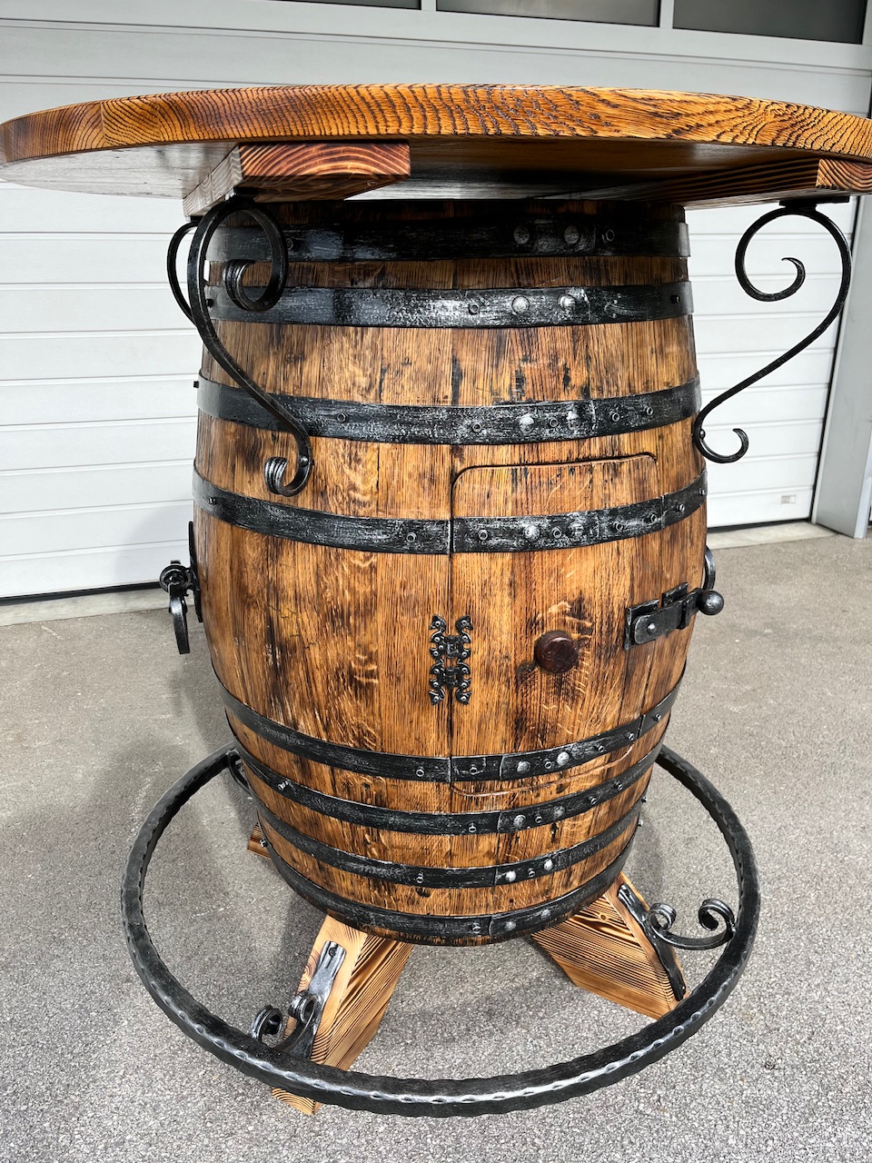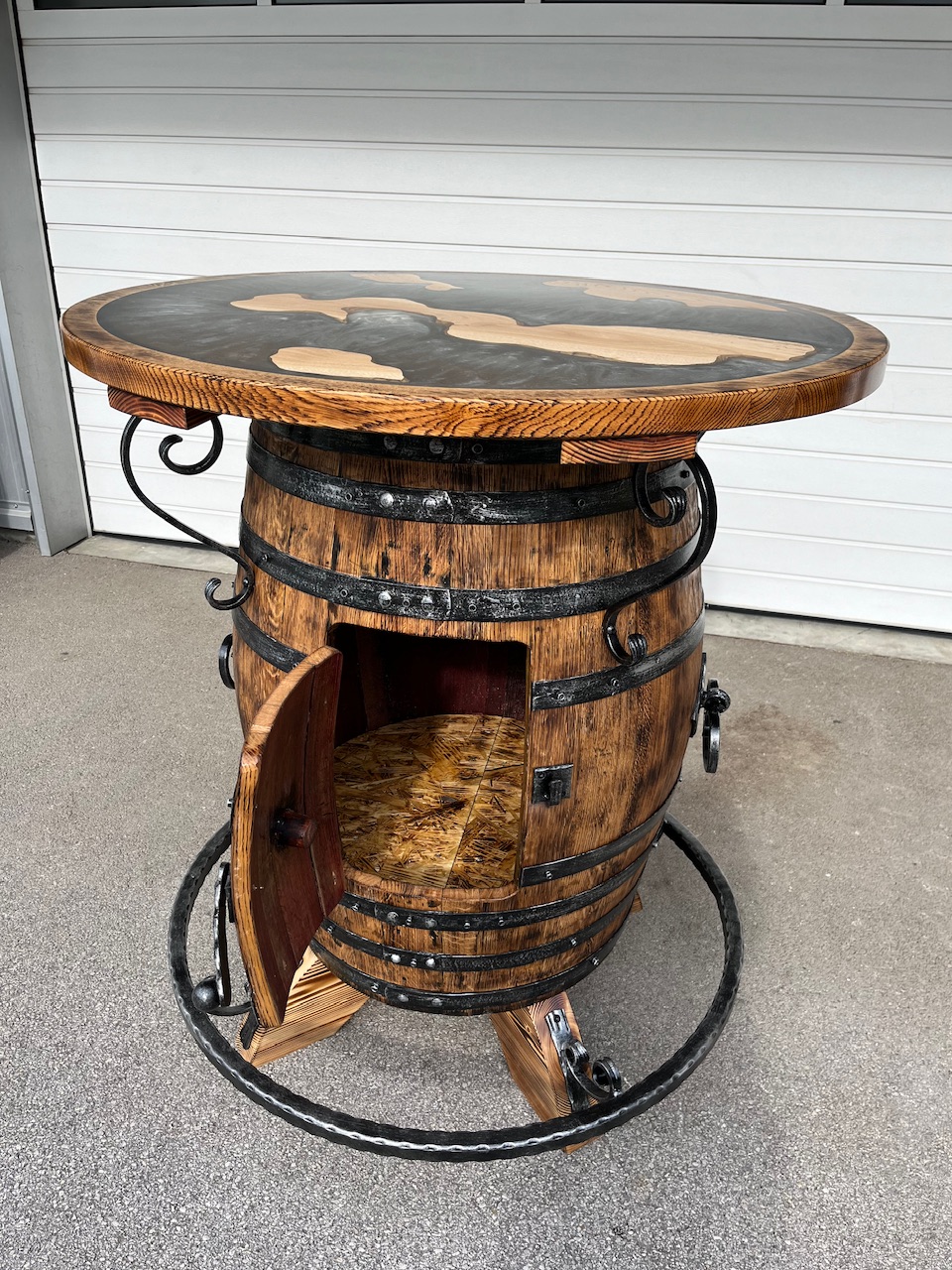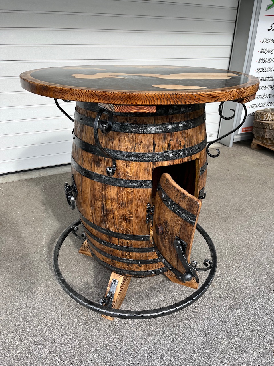 Barska miza narejena iz hrastovega soda. Višina mize od 110-115cm, fi plošče je 100 cm oz. po naročilu.