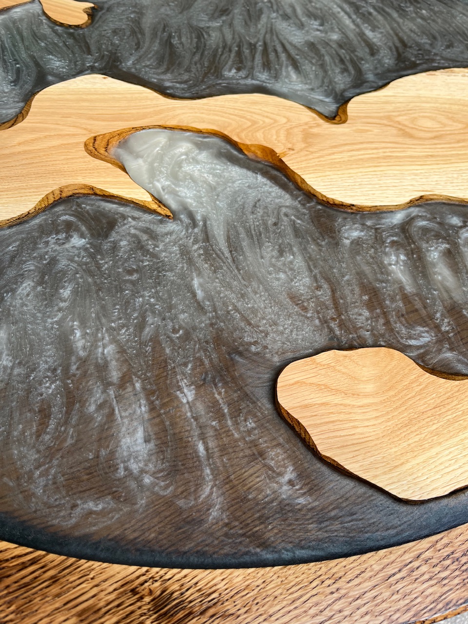 Obod plošče izdelan iz hrastovine, sredica zapolnjena z epoksi smolo.