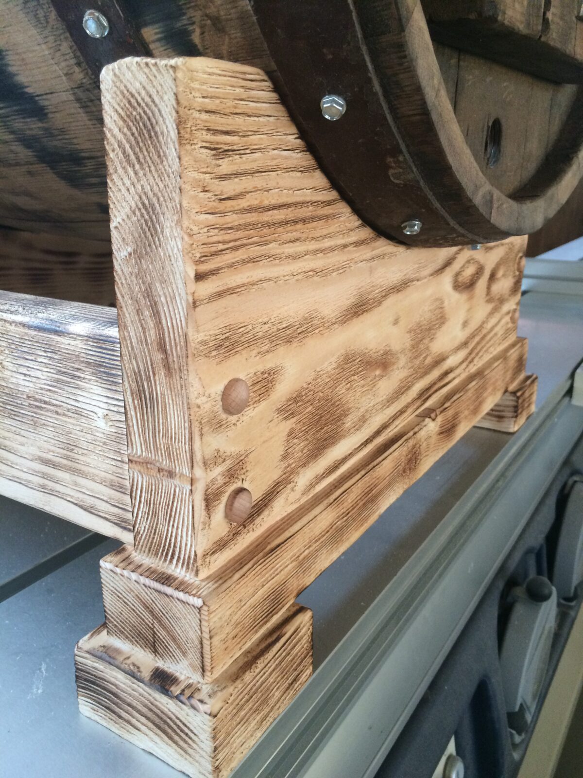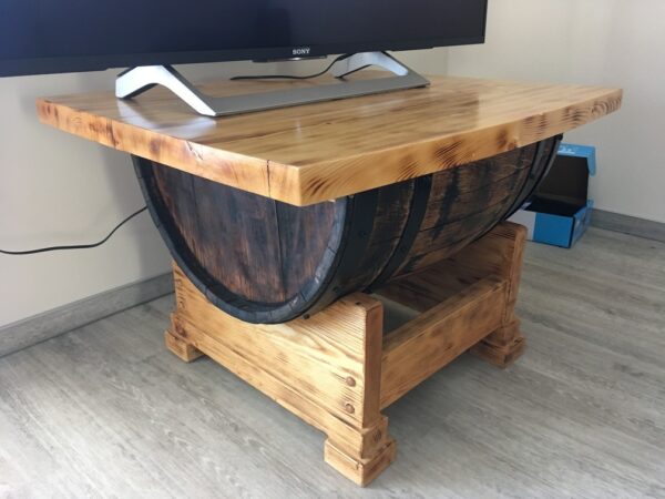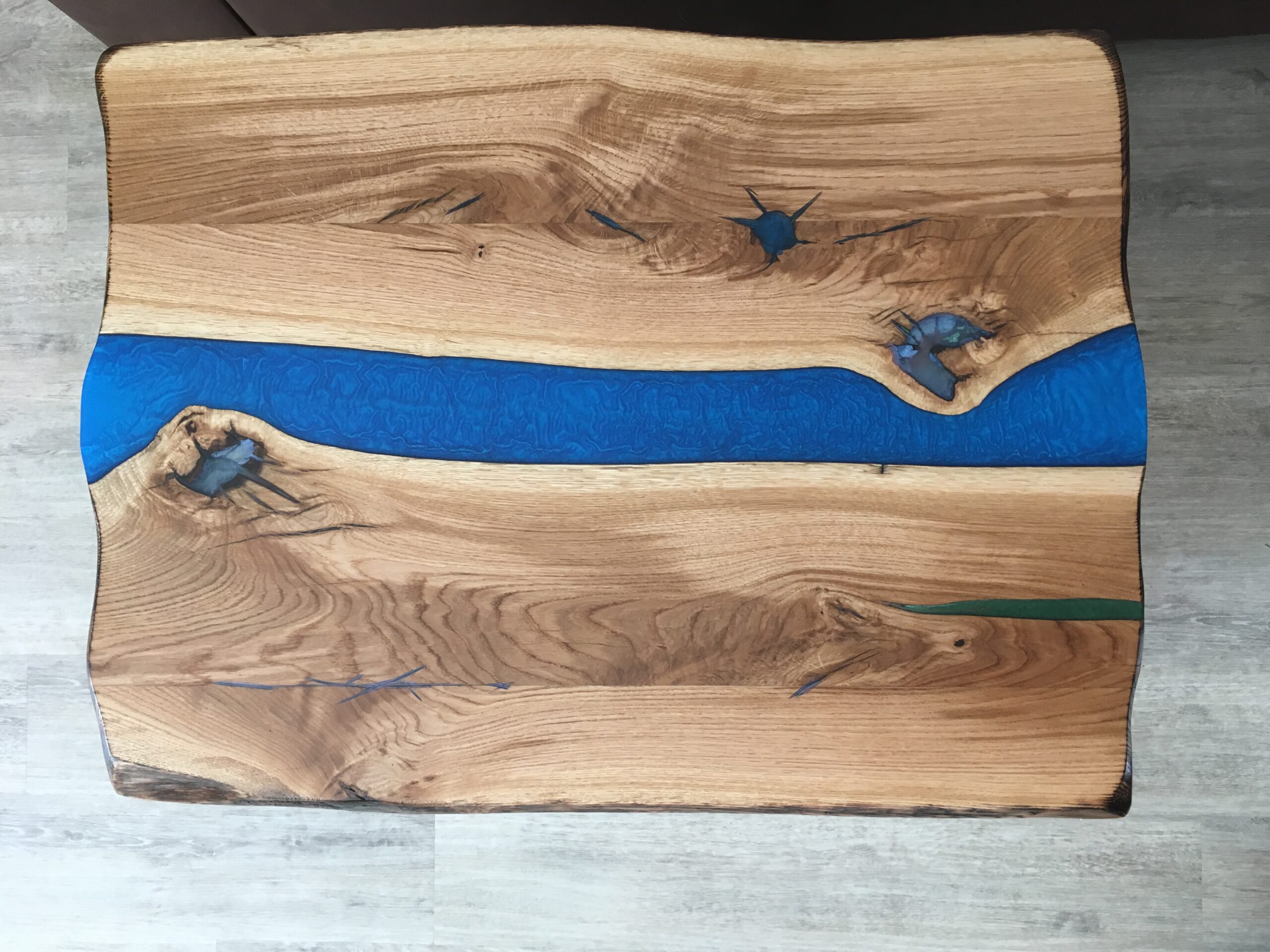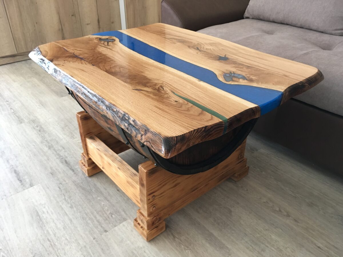 Klubska mizica iz hrastovega soda. Razpoka polnjena z modro epoksi smolo.