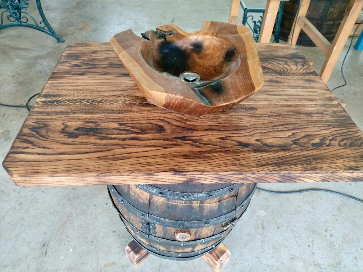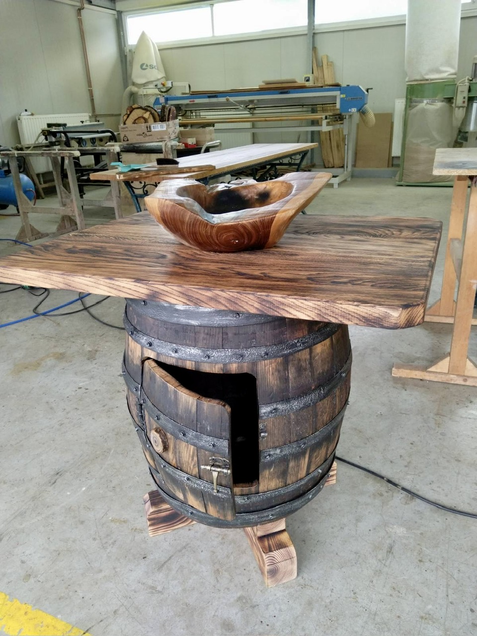 Lesen umivalnik izdelan iz tikovine ter omarica iz hrastovega soda, na kateri so narejena vratca, ki služijo vgradnji sifona, bojlerja, itd.