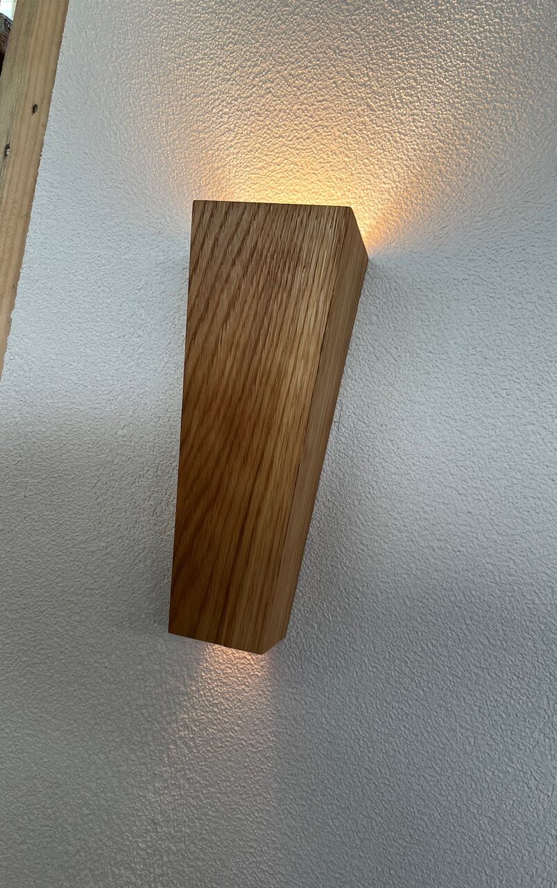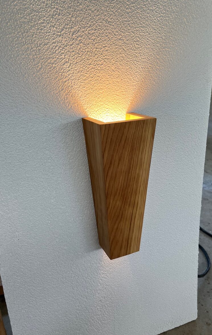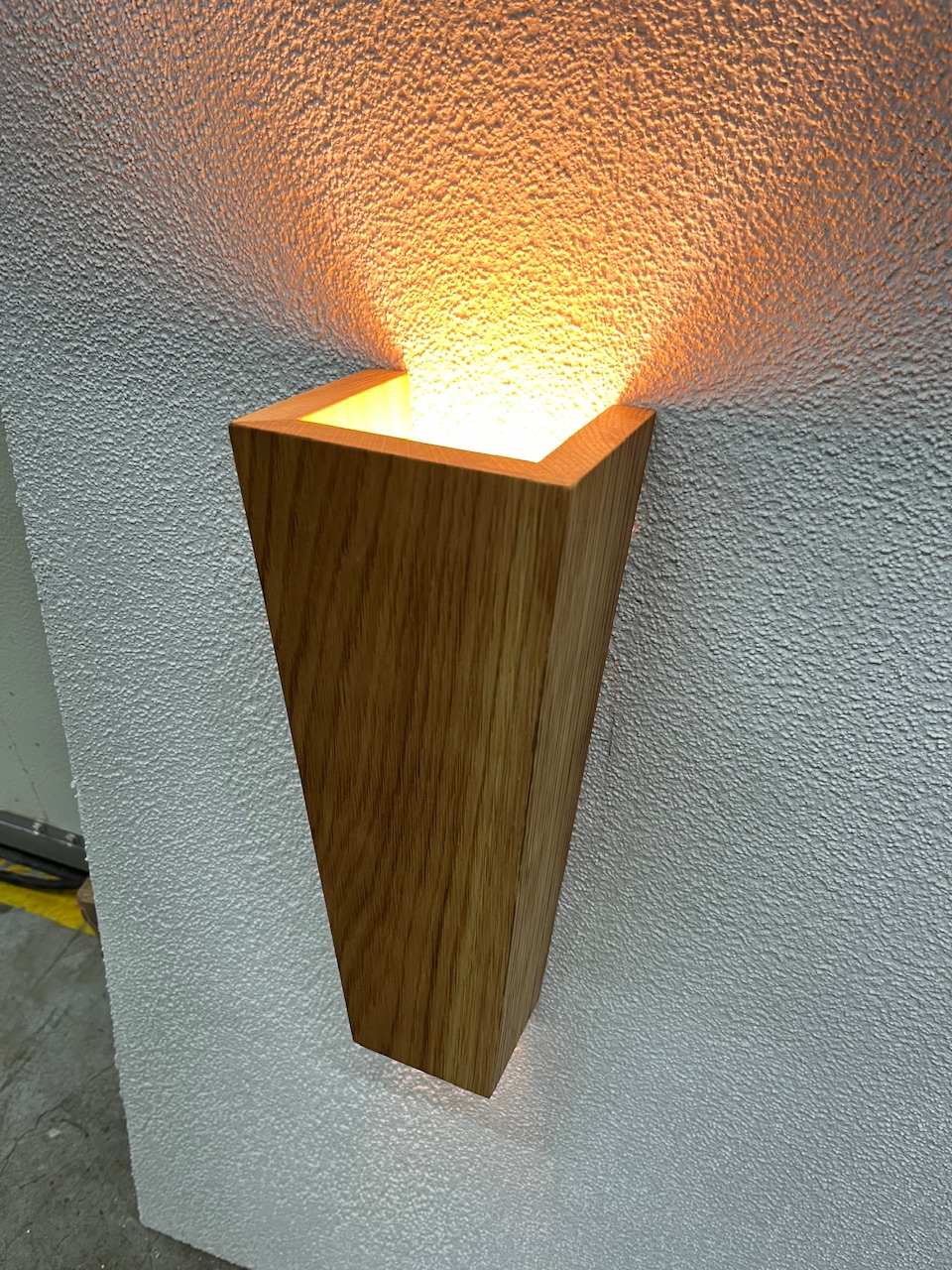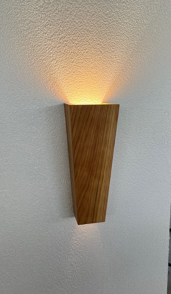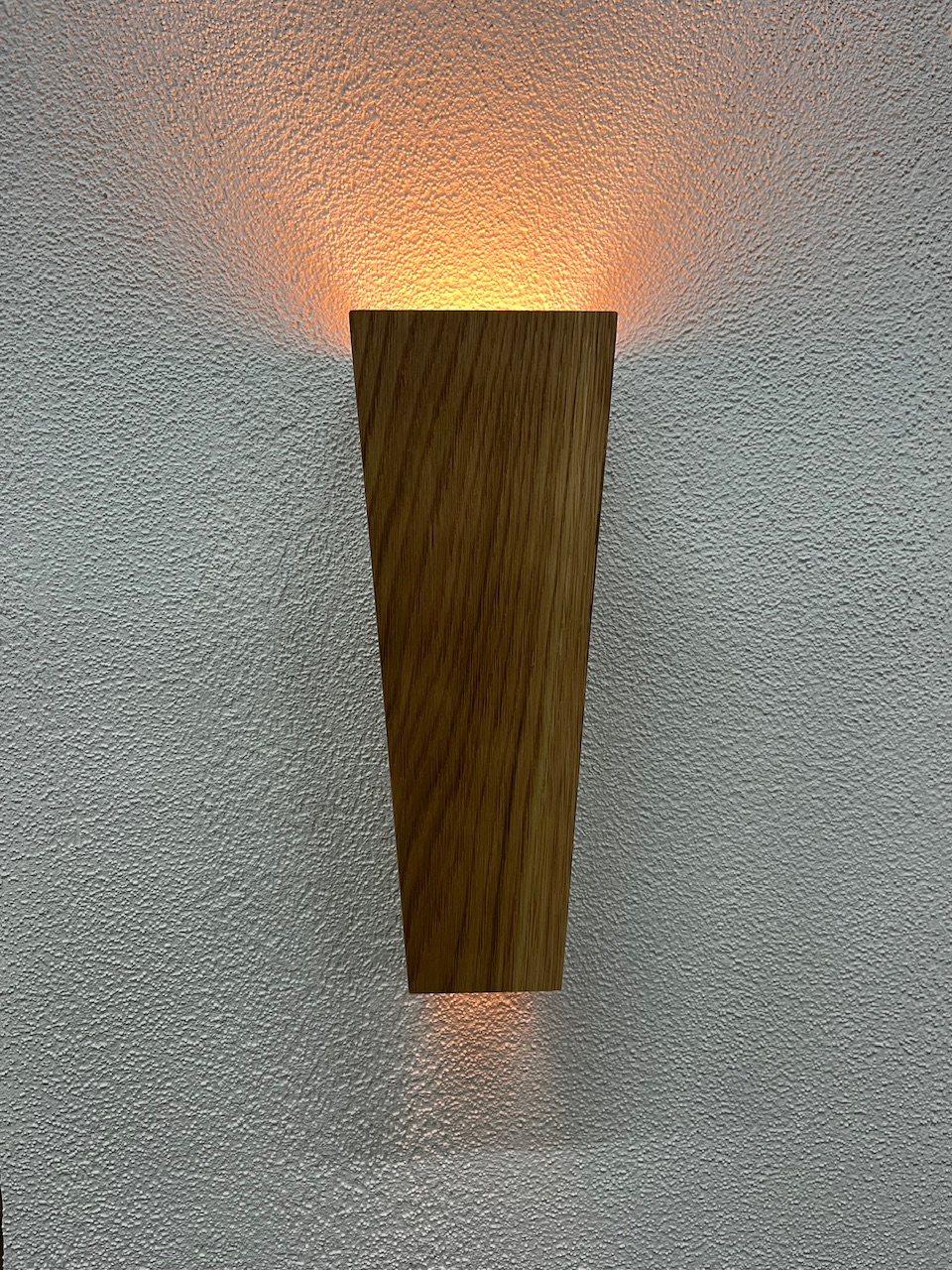 Konusna stenska svetilka, izdelana iz hrastovine.