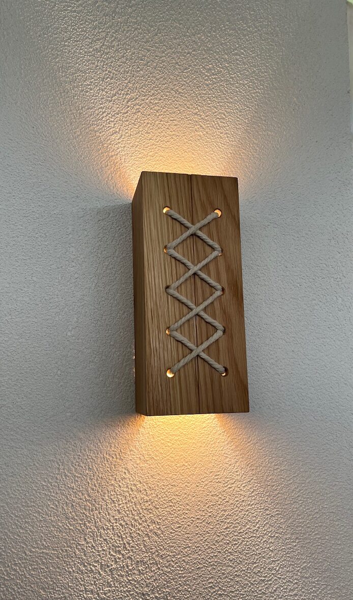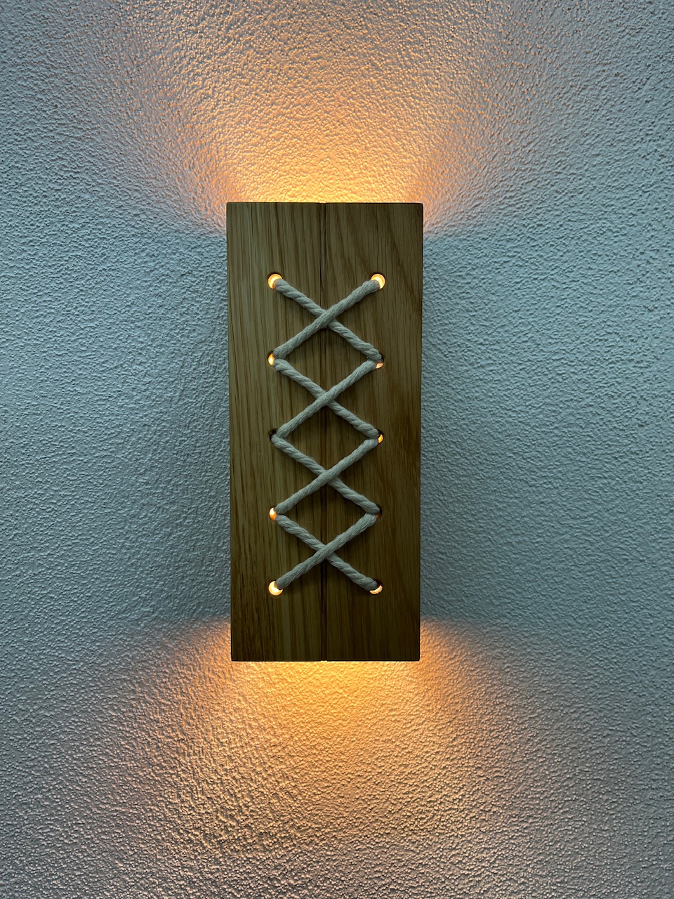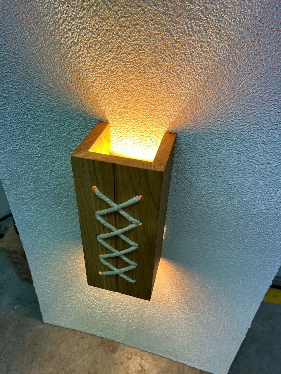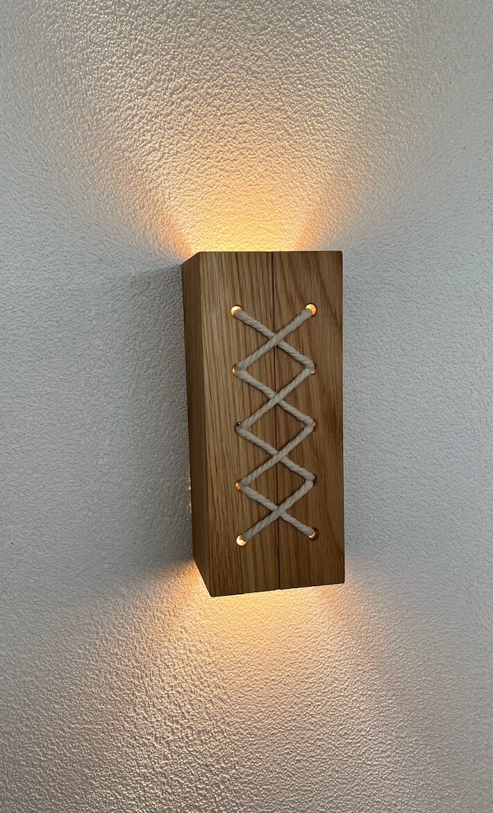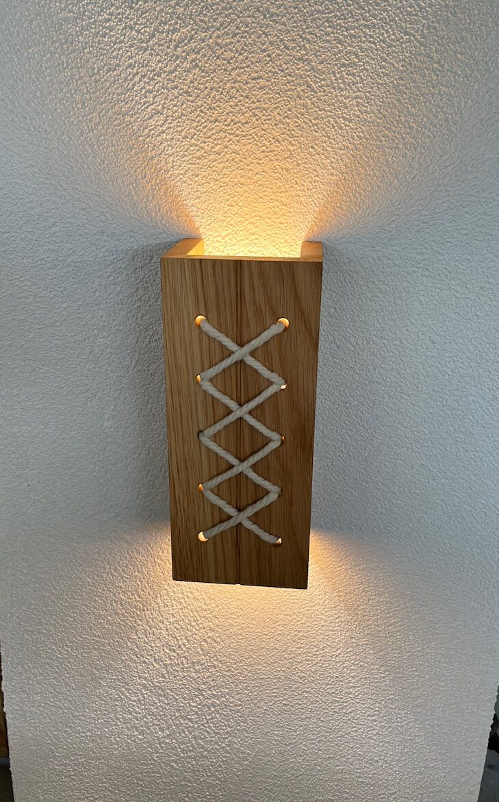 Stenska svetilka z vrvico, izdelana iz hrastovine.