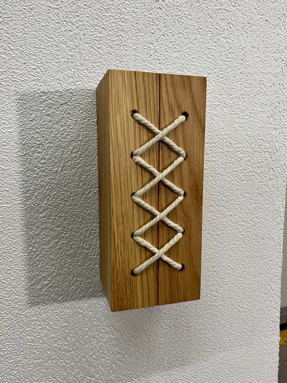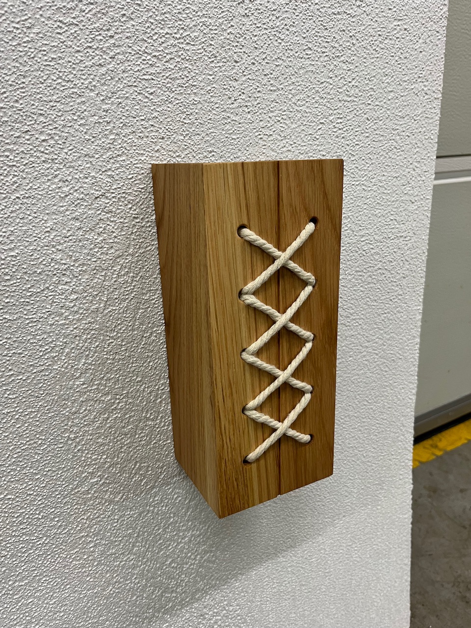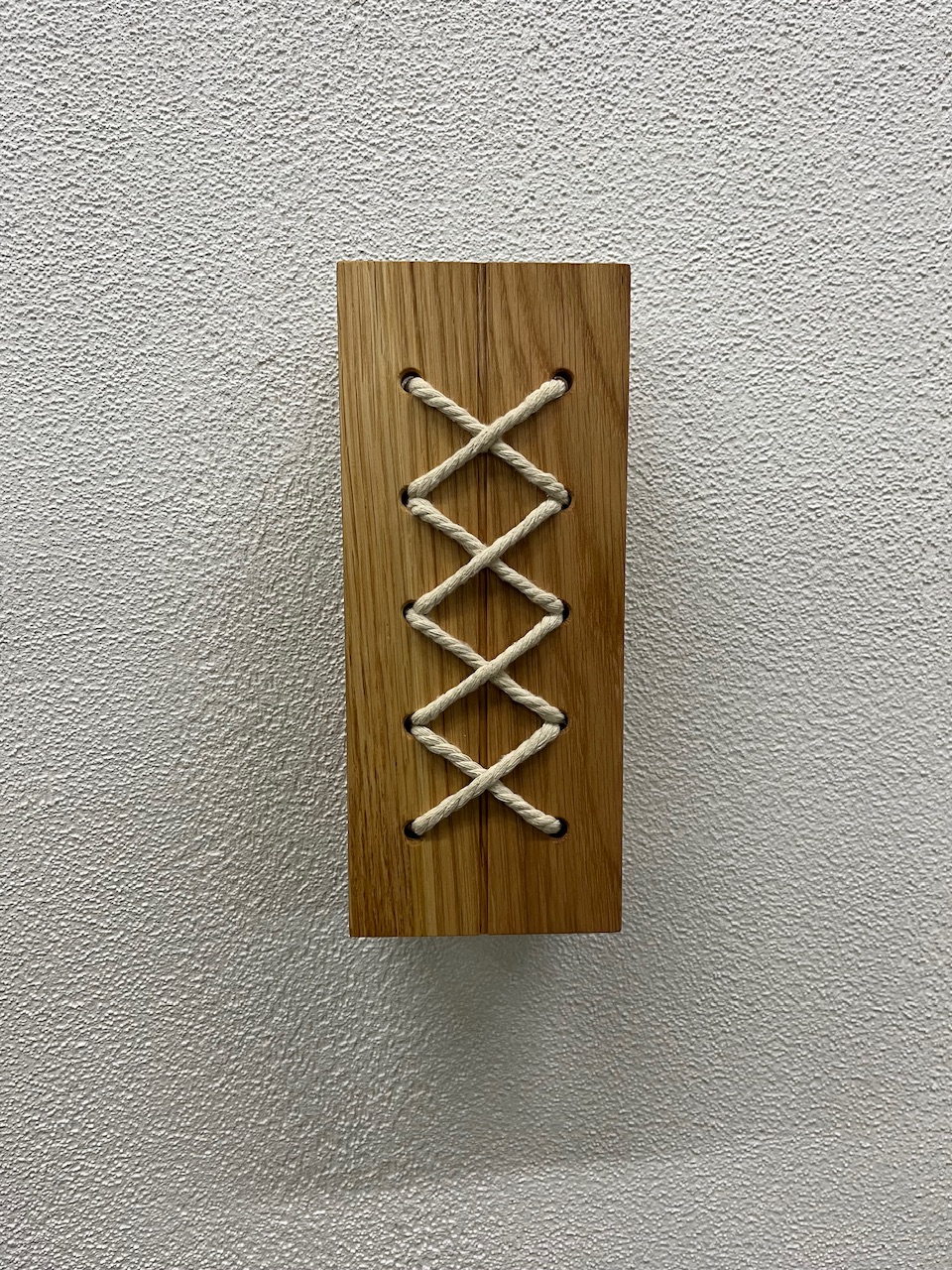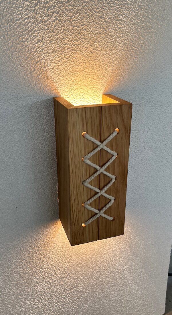 Stenska svetilka z vrvico, izdelana iz hrastovine.